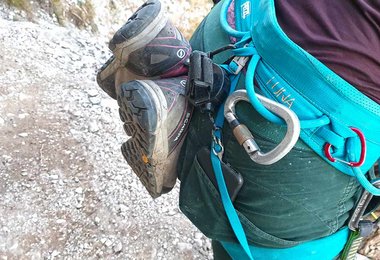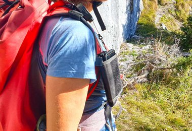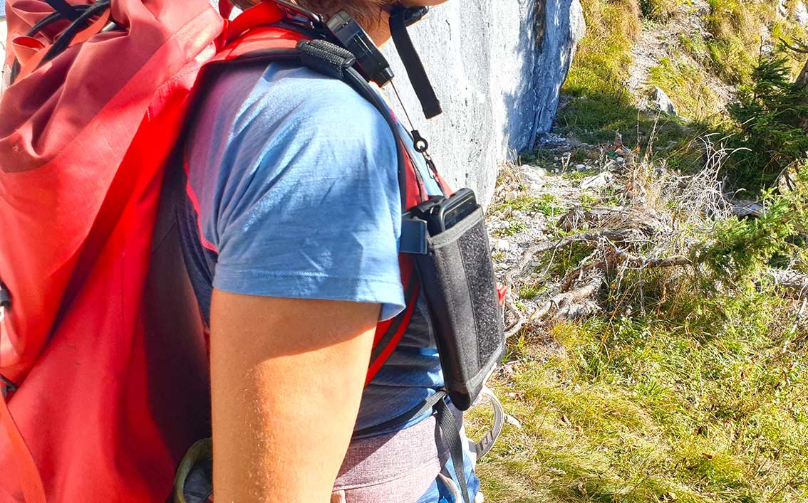 Wir haben die Reeloq-Tasche, in der man das Handy - verbunden mit dem Schnurzugsystem -verstauen kann, auch am Schulterträger des Kletterrucksacks montiert. Beim Klettersteiggehen ist das problemlos möglich und auch der ideale Platz für das Telefon während dem Klettern. Beim Felsklettern ist die Aufbewahrungstasche aber etwas im Blickfeld zur Materialschlaufe des Klettergurtes, man sieht nicht gut zu den Expressschlingen und Keilen. Somit haben wir die Befestigung am Klettergurt beim Felsklettern favorisiert.