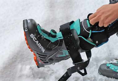 Am oberen Ende des Schuhes sorgt ein als Schnalle ausgeführter Klettverschluss für den nötigen Halt bei der Abfahrt. Beim Anziehen zieht man den Klettverschluß etwas fest, lässt aber die Schnalle geöffnet. Am Ender der Skitour bückt man sich am Gipfel hinunter und schließt einfach nur die Schnalle. Der Scarpa F1 lässt sich mit drei Handgriffen sehr schnell für die Abfahrt fixieren – Boa-Verschluss zudrehen, obere Schnalle schließen und hinten den Bügel nach unten klappen und einrasten lassen. Geht im Grunde gleich schnell und funktionell wie bei Wettkampfschuhen!