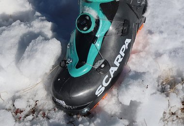Aber fangen wir von vorne an: Bei Scarpa haben Boa-Verschlusssysteme schon lange Tradition. Vom Wettkampfschuh Scarpa Alien hat der Boa-Verschluss am Vorderfuß nun den Weg zum Ottonormalverbraucher gefunden. Mit einer simplen Drehbewegung lässt sich über ein mit dünnem Drahtseil ausgeführtes Zugsystem der Vorderfuß komplett fixieren. Will man die Fixierung lösen, muss man nur den runden Drehverschluss in die Höhe ziehen - das dünne Drahtseil (und damit die Fixierung am Vorderfuß) ist locker.