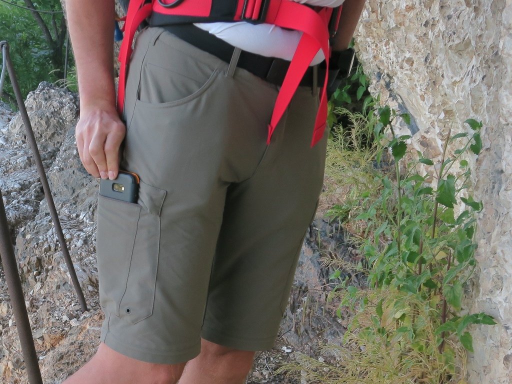 - Haupttaschen (2x, ohne Reißverschluss): im Vergleich zu Konkurrenzmodellen eher klein, größere Gegenstände können beim hohen Steigen rausrutschen, sorgenfreie Nutzung beim Klettern und Klettersteiggehen nicht möglich
