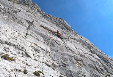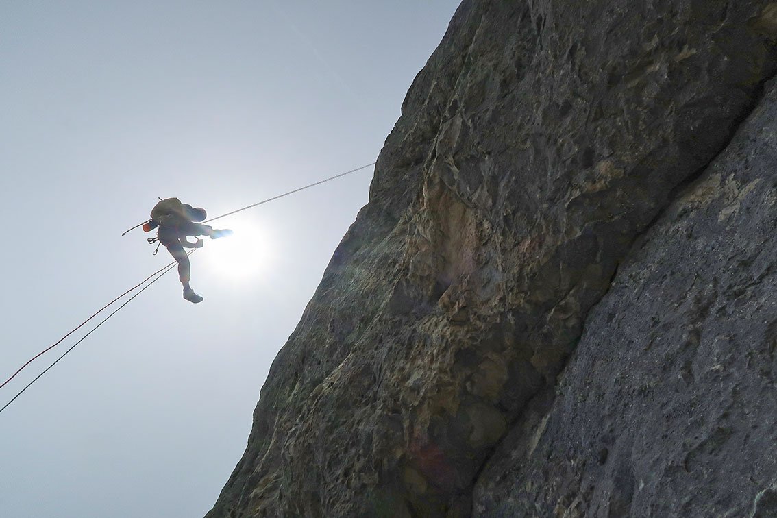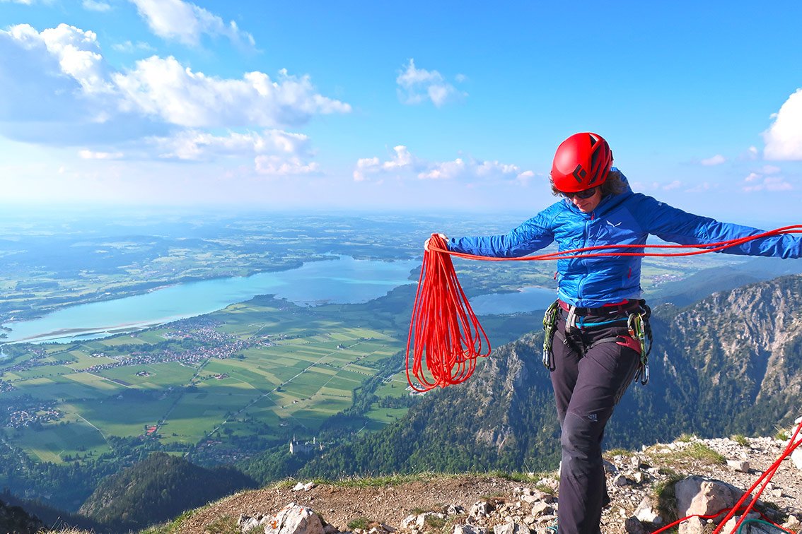 Wir konnten weder im Gewicht noch beim Seilhandling einen Unterschied zu anderen Doppelseilen – die wir in der Regel in Zwillingsseiltechnik anwenden – feststellen. Das Seil fühlt sich einen Tick härter, irgendwie stabiler an. Beim Einhängen in die Express oder beim Abseilen läuft alles wie gewohnt, das Klippen der Zwischensicherung geht gefühlsmäßig sogar etwas besser von der Hand.