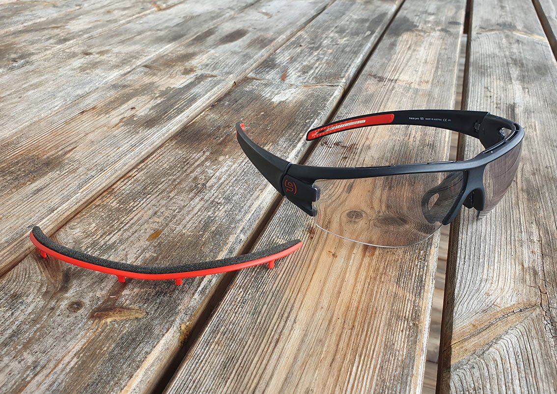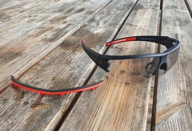 Die Evil Eye Trace Pro ist eine leichte, sehr robuste und gekrümmte Sportbrille. Ein Nasenklipp aus Gummi und eine ober der Brille angebrachte, aber bei Bedarf abnehmbare Sweat Bar schützt die Augen vor herunter rinnendem Schweiß. Die Belüftung ist sehr gut und im Vergleich zur Adidas Terrex Pro viel besser. Ob es nun an der etwas schmaleren Konstruktion oder am unten randlosen Brillenglas liegt, konnten wir nicht festmachen. Fakt ist aber, dass die Evil Eye Trace Pro nicht stark beschlägt.