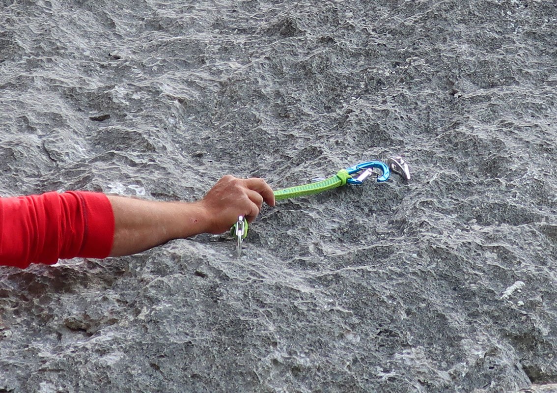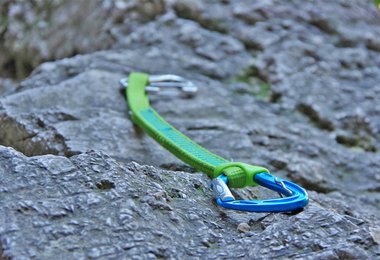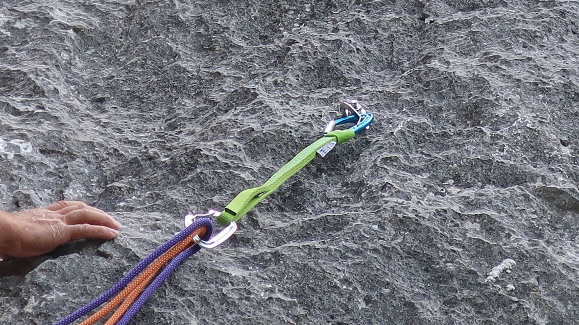 Der Griff ist klein, die glatte Platte darüber sieht nicht einladend aus, der Bohrhaken steckt aber ums Verrecken zu weit oben – vermutlich wurde die Route von einem Basketballer eingebohrt – wie hänge ich diesen Haken jetzt sicher ein um keinen Abgang zu machen. Vermutlich alle habe so etwas schon erlebt. Ähnlich einem Clipstick gibt es von diversen Firmen lange, tlw. sogar sehr lange versteifte Expressschlingen, mit denen man dieses Problem löst.