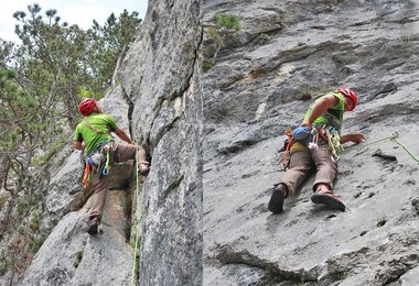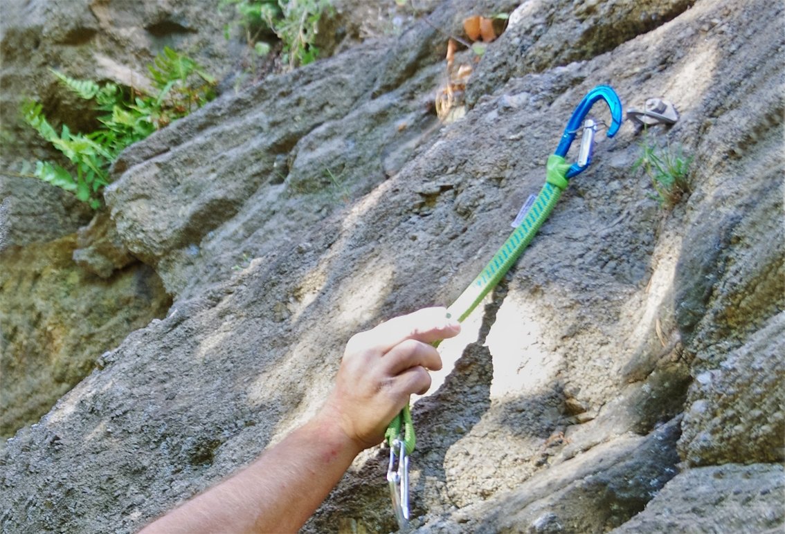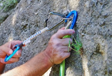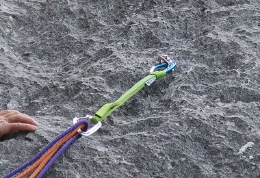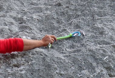 Wenn der Tricky einmal im Haken hängt, sollte man diesen beim Vorbeiklettern (oft gibt es beim Haken ja glücklicherweise doch einen guten Griff) gegen eine richtige Expressschlinge austauschen. Je nach Größe der Bohrhakenöse kann dieser Vorgang aber bei zwei Karabinern in der Öse zur echte Tortur werden (der Kong Karabiner lässt sich eher schlecht aushängen, wenn sich zwei Karabiner in der Lasche befinden). Da der Karabiner des Tricky sehr dünn ausgeführt ist, geht dieser Tausch wirklich sehr gut – beim sehr dicken Karabiner der Kong-Panic-Express gibt es da leider oft Probleme.