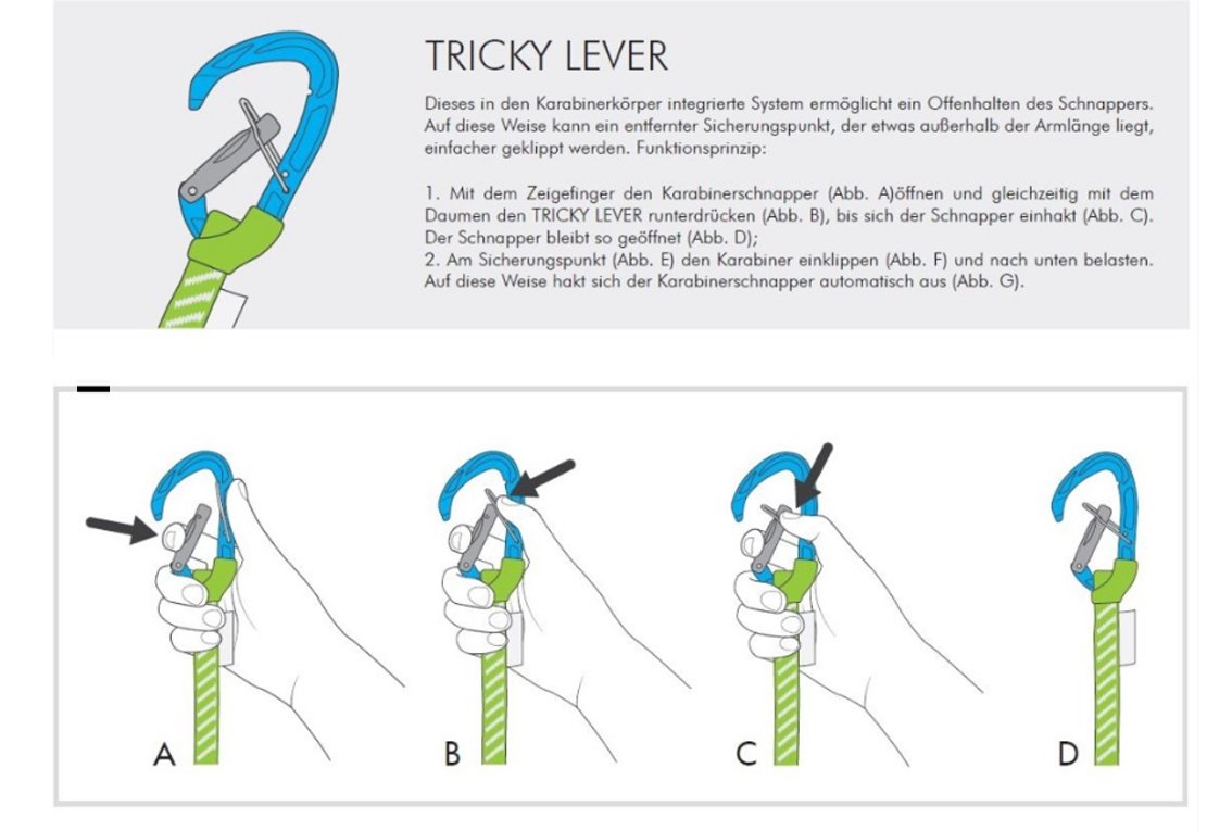 Neben dem dünnen Karabiner gibt es beim Tricky noch einen weiteren Vorteil, man kann den Tricky quasi einklappen und ihn so recht kurz am Gurt oder im Rucksack verstauen. Bei der Kong-Panic-Express geht das leider nicht, hängt diese beim Fußabstieg am Klettergurt, muss man darauf achten, dass man nicht über die Kong-Verlängerung stolpert.