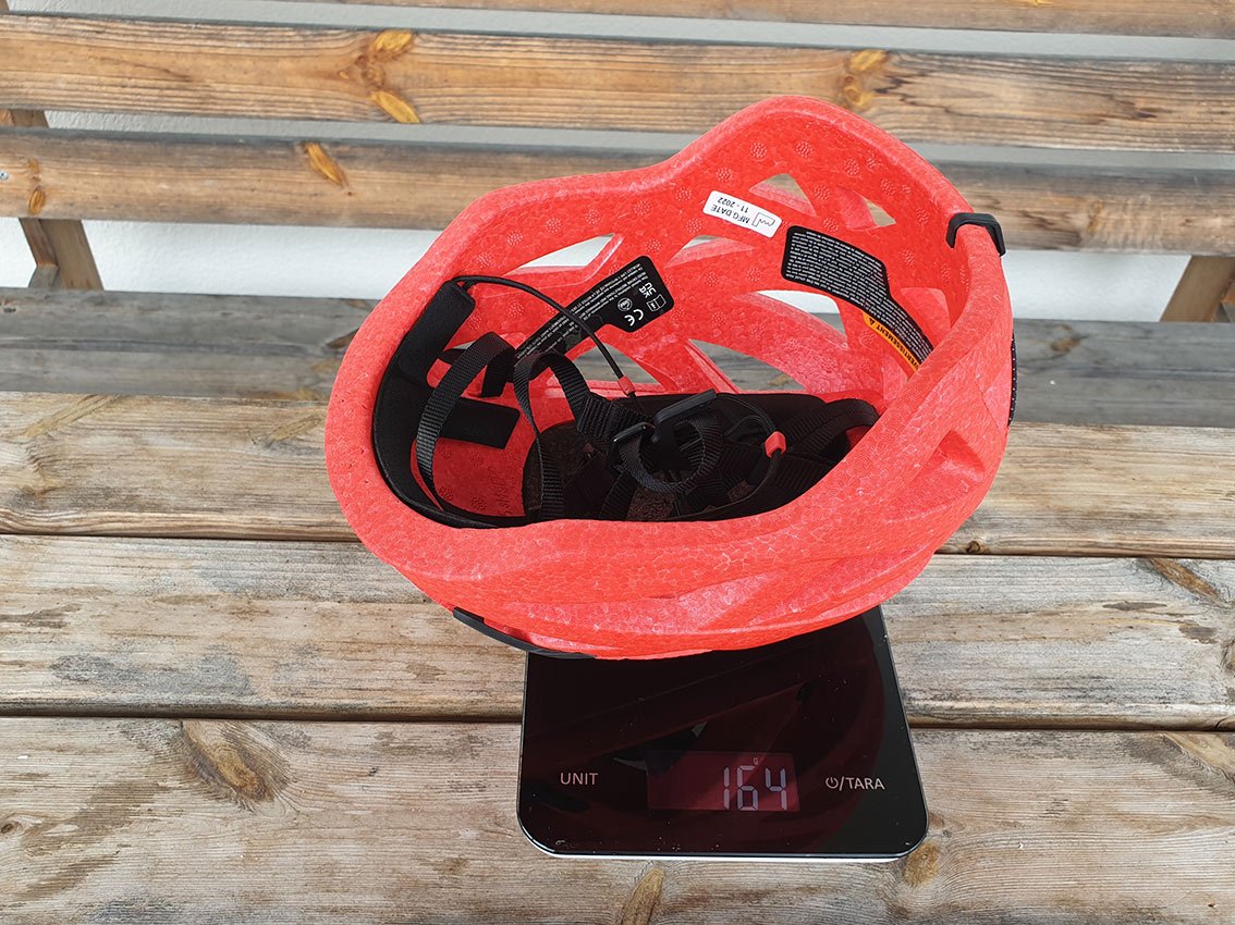 Das Hauptargument beim Vapor Kletterhelm ist natürlich das Gewicht: Black Diamond gibt die Helme mit S/M 155 Gramm und M/L mit 180 Gramm an. Unsere Abwaage mit der Küchenwaage hat bei der Größe S/M 164 Gramm ergeben, das ist ein Wert, der sich wirklich sehen lassen kann! Das Gewicht (Herstellerangabe) ist beim Vapor Helm das niedrigste in seiner Produktgruppe, naturgemäß weicht das in der Realität (bei uns auf der Küchenwaage) bei allen Herstellern aber immer etwas ab. Da sich im Klettersport am Ende alles um das Gewicht dreht, man spart ein wo es nur möglich ist - und nur selten gelingt dies am eigenen Bauch - da kommt der ultraleichte Vapor Helm als unterstützende Maßnahmen genau richtig!