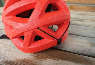 Ähnlich wie bei den anderen Herstellern ist der ultraleichte Vapor Helm ein Mix aus diversen Leichtbaustoffen (quasi also Styropor und oben eine Schutzschicht aus härterem Polycarbonat). Beim Vapor Kletterhelm fallen aber sofort die vielen Lüftungslöcher auf, wir haben die mal durchgezählt, es sind 18 Öffnungen, welche für die nötige Belüftung sorgen. Die harte Polycarbonatoberschicht ist nicht rund, sondern in Richtung Stirnseite etwas weiter nach vorne gezogen, in diesem roten Polycarbonatoval gibt es keine Lüftungslöcher (nur Edelrid hat Löcher in der harten Oberschicht). .