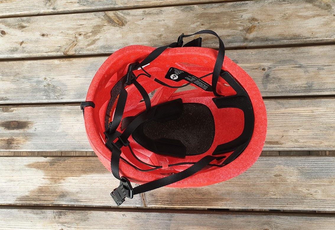 Bei leichten Helmen muss im Grunde überall an Gewicht gespart werden, auch beim Innenleben. Plastikschraubräder und ähnliches gehören der Vergangenheit an, man greift auf einfaches Bandmaterial mit wenigen Verstellschnallen zurück. Der Vapor ist aber doch etwas anders als die anderen Konkurrenten von Petzl und Edelrid - er hat eine zusätzliche dünne Kordel, welche vom Hinterkopf nach vorne zur Stirnauflage führt. Dadurch kann man den Vapor Kletterhelm noch etwas genauer einstellen und er liegt irgendwie etwas fester am Kopf an. Auch interessant, dass der Vapor trotz zusätzlicher Kordel immer noch vom Gewicht her bei bzw. sogar unter der Konkurrenz bleibt.