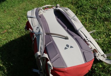 Der Rucksack ist unten sehr schmal und oben weit, dass hat den Vorteil, dass man alles (am Ende auch den Helm) gut in den Rucksack bekommt. Beim Klettern lässt sich der obere Teil mit den Zurrbändern gleich schmal zurren wie der untere. Der Hüftgurt ist schmal und diesen kann man am Einstieg der Klettertour schnell abnehmen (muss nicht gefädelt werden). Highlight bei Vaude Scopi 32 LW ist aber sicher der geschäumte Rückenteil.