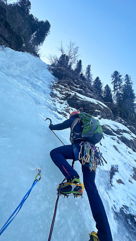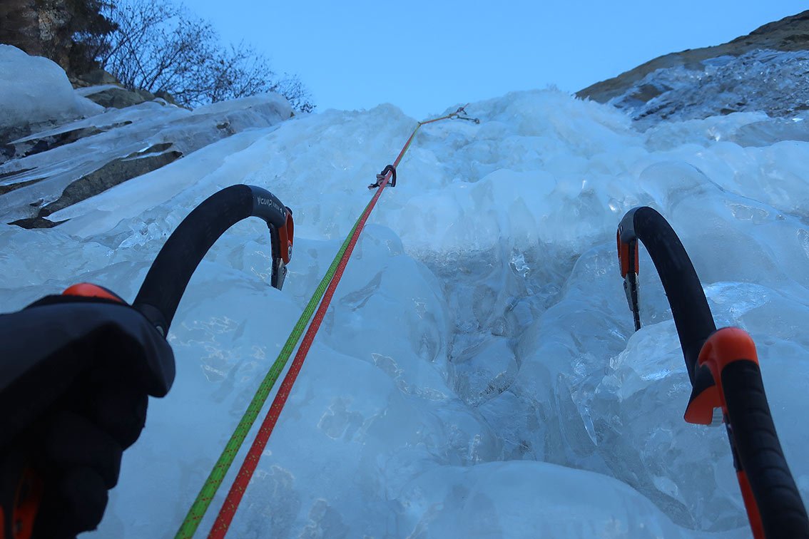 Wir haben uns die Eis-Version, also das klassische X-Dream Eisgerät, im Eispark Osttirol sowie an längeren Eiswasserfällen genauer angeschaut. Im Eispark konnten wir das X-Dream direkt mit anderen Top-Eisgeräten wie dem Petzl Nomic und dem Edelrid Rage vergleichen, auch der Vorgänger des X-Dreams war für einen direkten Vergleich verfügbar. Im reinen Eis ist das neue X-Dream deutlich besser als das alte Modell. Im Vergleich zu Nomic und Rage schieden sich allerdings die Geister: Durch den deutlich längeren Schaft des X-Dream war für eingefleischte Nomic-Kletterer etwas Umgewöhnung nötig.