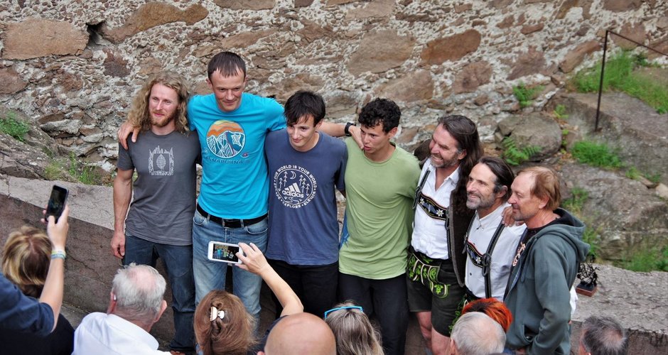 Ehemalige und die aktuellen Preisträger: v.l.n.r.: Mich Kemeter, Mikhail Fomin, Pedro und Tomas Odell, Thomas und Alexander Huber, Heinz Mariacher (c) Erhard Mitsche