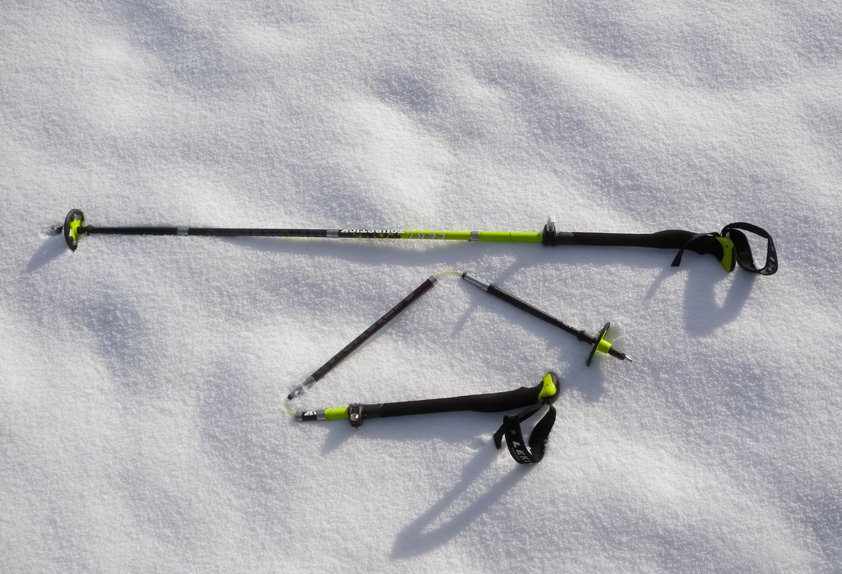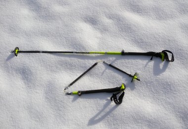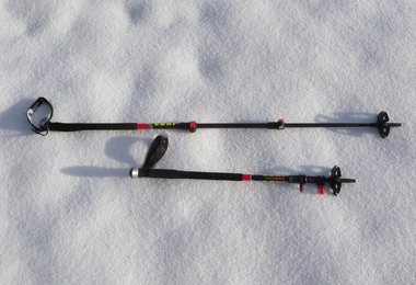 Der superklein zu verstauende Vario Stock wäre beim Mikadospielen vermutlich am schwersten vom Haufen zu nehmen - obwohl er trotz des innen liegenden Kevlarseilsystems nur 510 Gramm/Paar wiegt. Der Stock wird ähnlich wie eine Zeltstange zusammengebaut, mit einem Knopfsplint quasi automatisch fixiert. Die Höhe kann man auf dem obersten Teil mit dem Speed-Lock System einstellen (115 - 135 cm). Wie bei den meisten Carbon-Stöcken ist das untere Teil zum Schutz vor scharfen Skikanten aus Aluminium gefertigt. Der mit einen kantenfreien Aergon Griff ausgestattete Vario Stock lässt sich auf 39 cm zusammen legen und passt so spielerisch auch in kleinere Freeriderucksäcke.