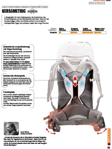 Versametric ist für mehr Kraftersparnis: die Konstruktion des Pendelhüftgurtes und der Rückenplatte verhindert, dass sich der Rucksack gegen Hüfte und Rücken verformt und ermöglicht kraftsparendes Tragen von schweren Lasten über lange Strecken.