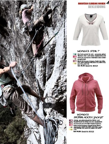 In der Mountain Climbing Serie ist ein großes Sortiment an technisch und optisch ausgefeilte Kletter- und Boulderbekleidung für Frauen, die ungestört nach oben wollen, zu finden. Bei kleine oder große Trekkingreisen bietet die Trek & Trail Line strapazierfähige, funktionelle Wetterschutzbekleidung für verschiedene Outdoor Aktivitäten.