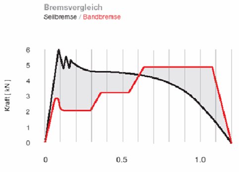 - Niedrigste Fangstosswerte und sanftes Abbremsen des Sturzes dank der Kombination aus dreistufigem Bremsband und der Bremsplatte