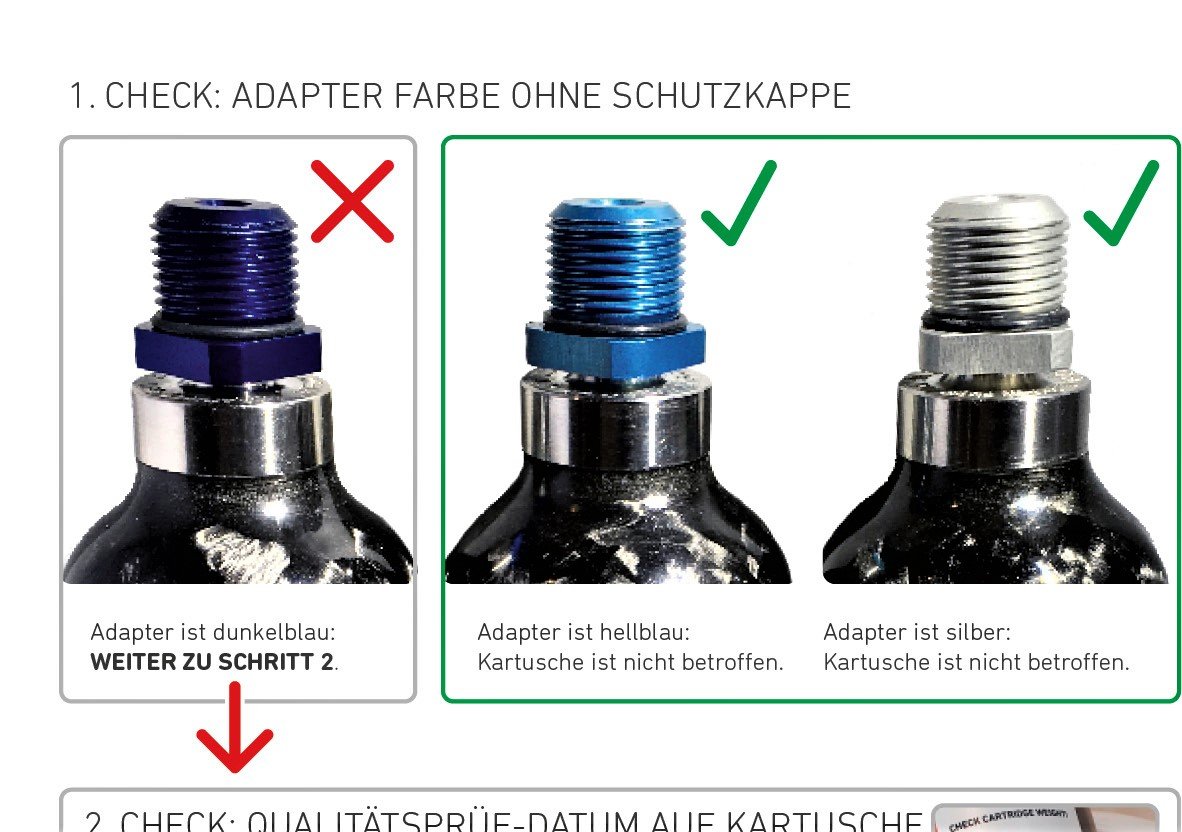 Kartuschen, die im Rahmen der Wiegeprüfung keinen Druckverlust aufweisen, können unmittelbar nach der Prüfung bedenkenlos verwendet werden. Betroffene Kartuschen mit Druckverlust können beim Fachhändler ausgetauscht werden.