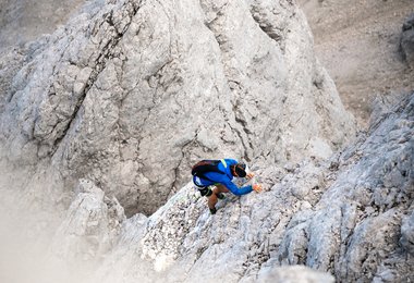 Die beiden Athleten starteten, nicht zuletzt wegen der hohen Temperaturen, erst um 15:20 Uhr am Königssee bei St. Bartholomä, mit der Hand im Wasser des Königssee. Nach zwei Stunden und 59 Minuten, um 18:19Uhr standen sie bereits am Südgipfel des Watzmanns! Aufgrund des späten Starts hatten sie die Wand fast für sich alleine, nur 4 Übernachtungsgäste auf der Biwakschachtel und dem Filmteam sind sie begegnet. Danach ging es aber nicht gleich via Wimmbachgries wieder bergab, sondern Richtung Norden zur Mittelspitze, die bekanntlich 1 Meter höher als die Südspitze ist und somit den höchsten Punkt des Watzmanns markiert.