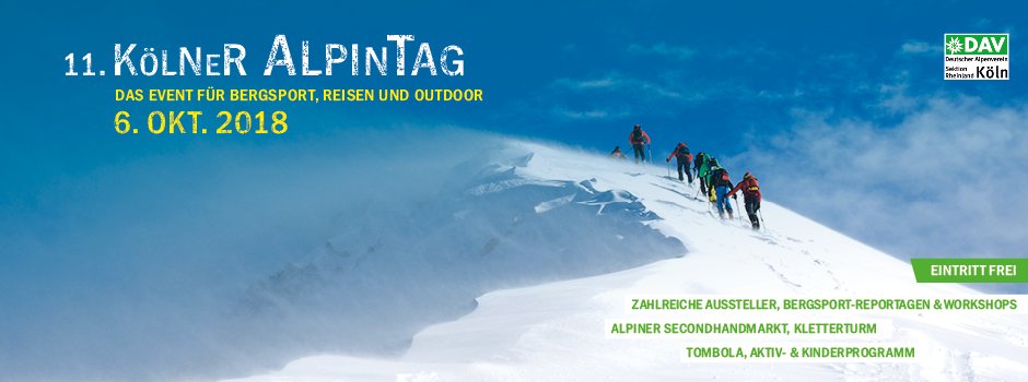 Die Alpenvereinssektion Rheinland-Köln lädt am Samstag, 6. Oktober 2018 zum Kölner Alpintag ins Forum Leverkusen ein. Zum 11. Mal wird sich einen Tag lang alles um die nächsten Draußen-Abenteuer drehen.