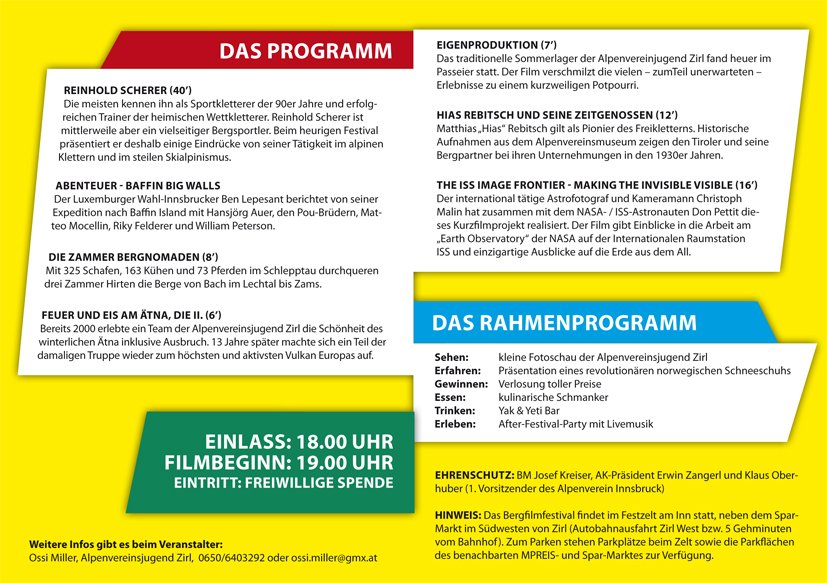 Hinweis: Das Bergfilmfestival findet im Festzelt am Inn statt, neben dem Spar-Markt im Südwesten von Zirl (Autobahnausfahrt Zirl West bzw. 5 Gehminuten vom Bahnhof). Zum Parken stehen Parkplätze beim Zelt sowie die Parkflächen des benachbarten M PREIS- und Spar Marktes zur Verfügung.