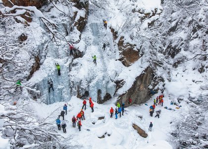 Bizarre Eisfälle, überhängende Boulder und zahlreiche Kletterstationen erwarten die Teilnehmer aus dem ganzen Alpenraum und dazu das neueste Material zum Testen.