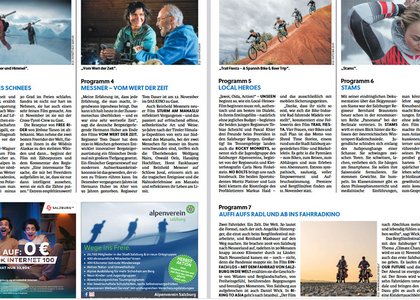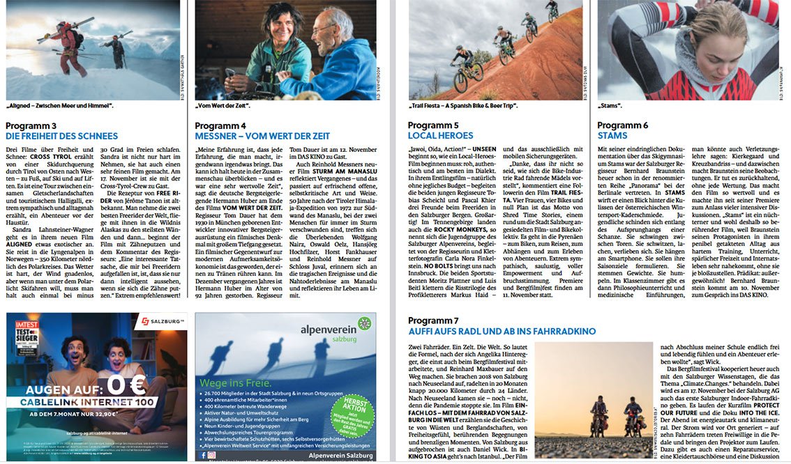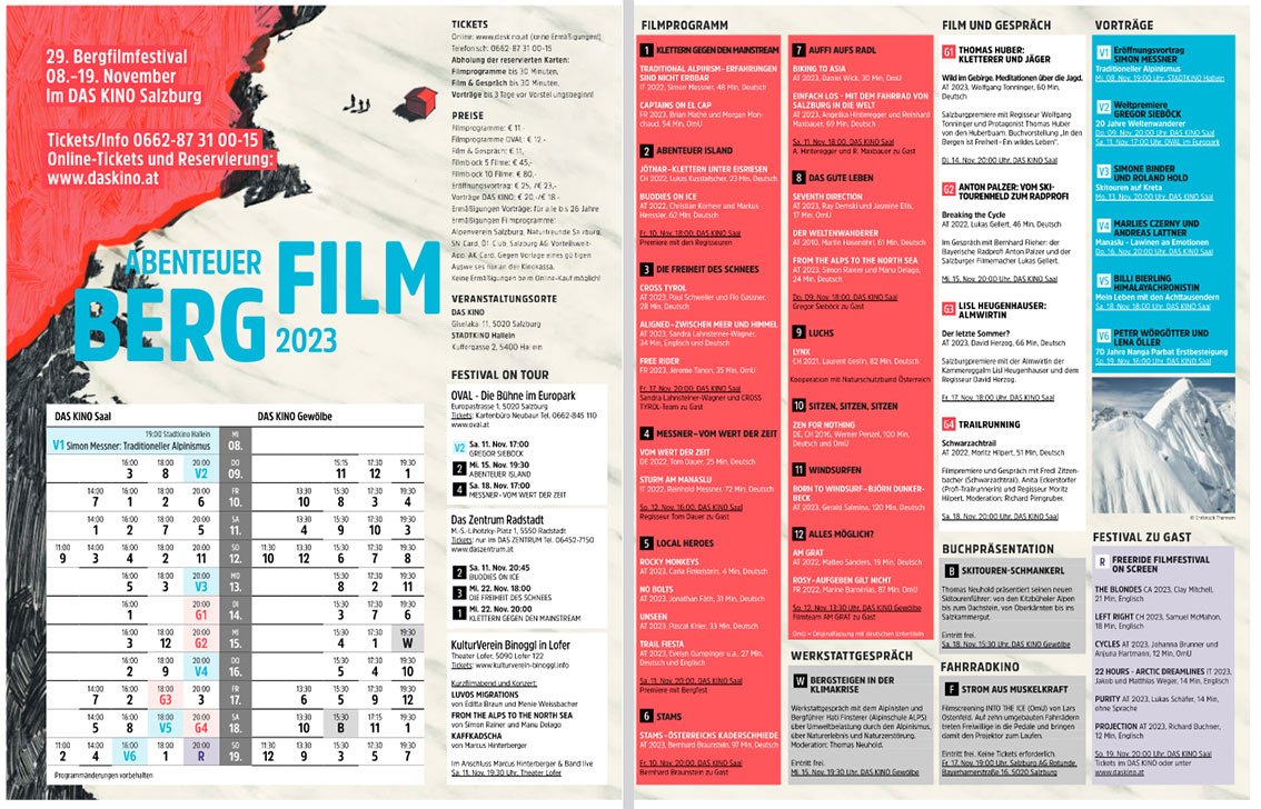 25 neue Bergfilme in 12 Programmen, Außenstellen im Stadtkino Hallein und im OVAL, auf Tour in Radstadt und in Lofer, eine Reparaturwerkstatt für Outdoor-Bekleidung bei der nagelneuen Bergbar, das erste muskelbetriebene Indoor-Fahrradkino Salzburgs, dazu Geschichten aus den heimatlichen Bergen: Huberbua Thomas Huber schlüpft in eine neue Rolle als Jäger, der Ramsauer Spitzensportler Anton Palzer verwandelt sich vom Skibergsteiger in einen Profiradfahrer, Elisabeth Heugenhauser lässt uns an ihrem Alltag auf der Kammereggalm in Maishofen teilhaben, und mit der Profi-Trailrunnerin Anita Eckerstorfer laufen wir den legendären Schwarzachtrail. Wir sind lokal verankert und denken global: Himalaya-Chronistin Billi Bierling reflektiert die positiven und negativen Seiten des modernen Expeditionstourismus, Peter Wörgötter nimmt uns mit auf eine Zeitreise ins Karakorum der 70er und 80er Jahre, und Simone Binder zeigt, dass man auf Kreta nicht nur Baden, sondern auch Schifahren kann. Schauen Sie sich das an!