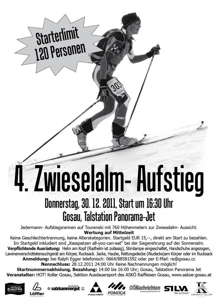 Für Zuschauer und Angehörige der Teilnehmer gibts heuer erstmals einen Sonderservice der Skiregion Dachstein West: um EUR 5,-- kann eine Berg- und Talfahrt mit der 8er-Gondelbahn erstanden werden.....Auffahrt bis spätestens 17:00 Uhr, Talfahrt um 21:00 Uhr
