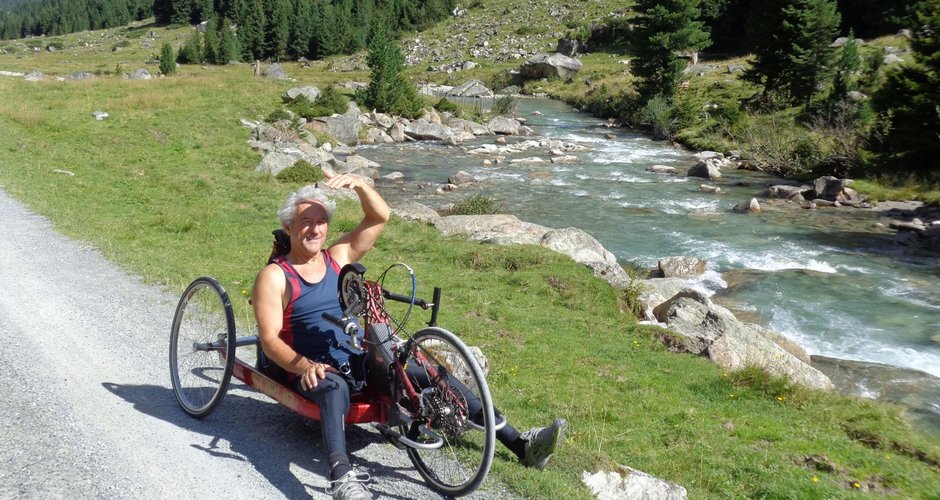 anzutreffen ist, irrt sich. Mit Hilfe eines handbetreibbaren Fahrrades (Handbike) ist er nach wie vor oft in den Bergen unterwegs, wobei auch