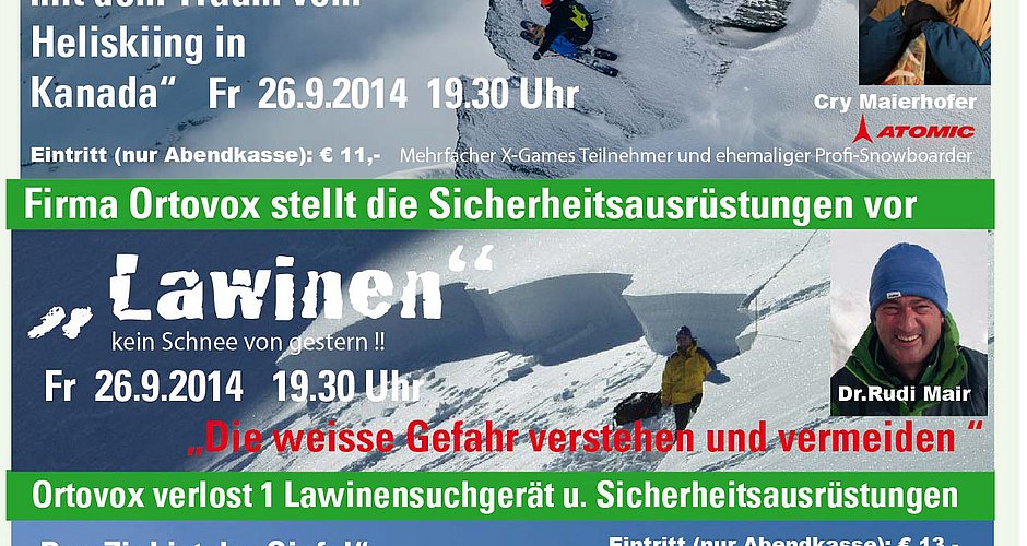 Referent und Lawinenexperte Mag. Dr. Rudi Mair schrieb das Buch „Lawine - Die 10 entscheidenden Gefahrenmuster erkennen“, in dem er häufige Gefahrenmuster von Lawinen beschreibt. Außerdem leitet Mair seit 1999 den Lawinenwarndienst Tirol und ist allgemein beeideter und gerichtlich zertifizierter Sachverständiger für Meteorologie, Lawinenkunde, Lawinenunfälle und Lawinenschutz. Nach dem Vortrag sehen die Gäste eine Videopremiere mit der Ortovox-Winterkollektion 2014/15 und können an einer Verlosung von Sicherheitsausrüstungen und eines Lawinensuchgerätes des führenden Mountainwear-Ausrüsters teilnehmen sowie ein gratis Buffet genießen.