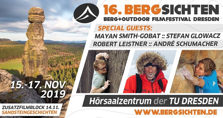 Wegen der großen Nachfrage gibt es für den Filmblock "Sandsteingeschichten" am 14.11.19, 20:00 Uhr eine Zusatzveranstaltung, ebenso für den Vortrag von Stefan Glowacz am 17.11.19, 16:45 Uhr.