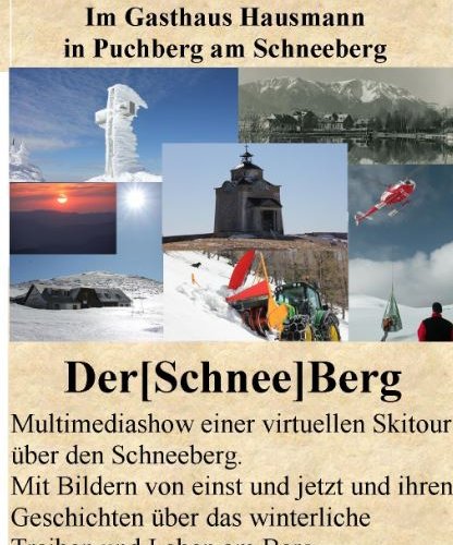 Karl Tisch lädt zu einer virtuellen Skitour auf den Schneeberg. Gestartet wird im goldenen Herbst mit vielen tollen Impressionen. Danach kommt der Winter ins Land und sehr zeitig in der Früh startet der Aufstieg. Hier werden einige Aufstiegsrouten auf der nördlichen Schneebergseite erklärt. Am Gipfel angekommen werden viele Objekte und Hütten in verschiedenen alten und neuen Ansichten gezeigt und geschichtlich erklärt. Hinunter geht es durch die tiefverschneite Breite Ries, wo davor eine Lawine abgegangen ist. Weiters sind noch Bilder einiger Bergrettungseinsätze und vom legendären Drei Ries Rennen in den 50er Jahren mit Toni Sailer und anderen Skistars zu bewundern. Von den Fräsarbeiten der Zahnradbahnstrecke und Transportflüge der Hüttenwirte.