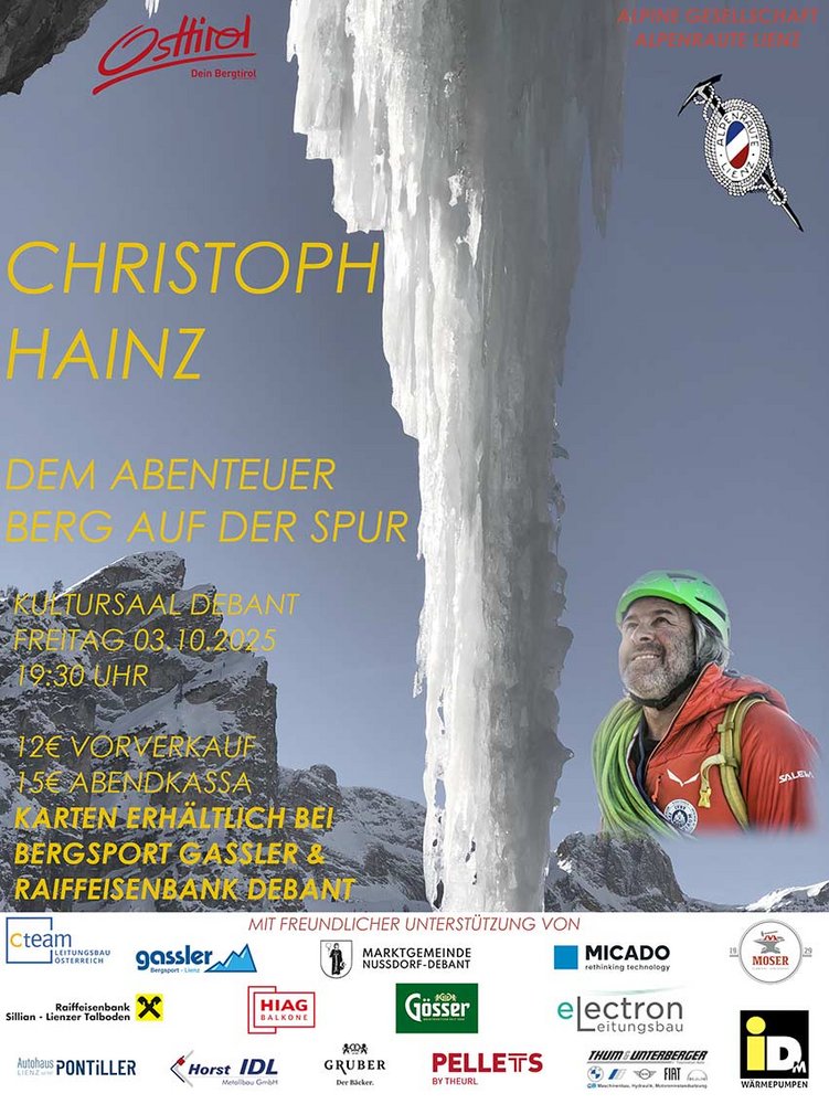 Die Alpine Gesellschaft Alpenraute Lienz (Veranstalter vom Laserzlauf) organisiert am 03. Oktober 2025 in Debant einen Vortragsabend mit einem der bekanntesten Südtiroler Alpinisten unserer Zeit... Christoph Hainz!