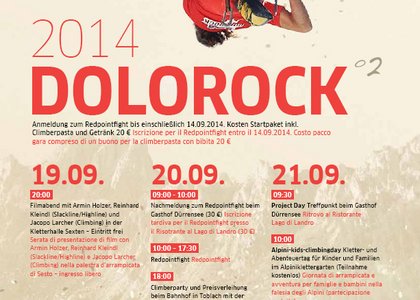 Nach dem Erfolg im letzten Jahr organisiert der Kletterverein Gamatzn zum zweiten Mal das Dolorock Climbing Festival im Höhlensteintal. Das Wochenende ist vollgepackt mit Action wie dem Redpointfight, dem Alpini–kids-climbingday, vielen neuen Routen, Erzählungen und Filmen von Stars der Szene, sowie jeder Menge Spaß. Für die besten Dolorocker/Innen gibt es auch ein Preisgeld.