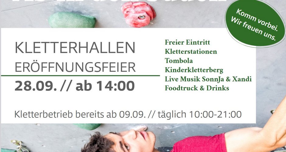Am Samstag, 28.09. findet bei freiem Eintritt die offizielle Eröffnungsfeier mit Kletterstationen, Kinderkletterberg, Tombola, Live Musik u.v.m. statt.