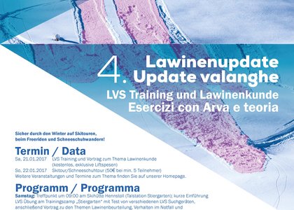 - Samstag, 21.01.2017 (kostenlos, exklusive Liftspesen) Treffpunkt um 09:00 an der Skihütte Hennstoll (Talstation Stiergarten, Sexten-Moos); kurze Einführung; LVS Übung am Trainingscamp „Stiergarten“ mit Test von verschiedenen LVS Suchgeräten. Anschließend Vortrag zum Thema Lawinenbeurteilung, Verhalten im Notfall und Tourenplanung.