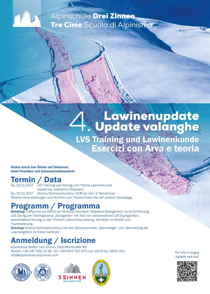 Am Samstag, 21.01.2017 findet in Sexten ein kostenloses Lawinenupdate in Zusammenarbeit der Alpinschule Drei Zinnen, Bergrettung Sexten und der 3 Zinnen Dolomites AG statt. Das Update richtet sich an Personen, die abseits der gesicherten Pisten und Wege unterwegs sind. Im praktischen Teil wird im Stiergarten-Lawinencamp der richtige Umgang mit der Notfallausrüstung trainiert und es können neue Lawinengadgets wie Airbag-Rucksäcke, LVS-Geräte usw. ausprobiert werden. Im theoretischen Teil werden Informationen zur optimalen Tourenplanung, richtigem Lesen des Lawinenlageberichts, Schneebeurteilung Verhalten im Notfall vermittelt. Am Sonntag, 22.01.2017 findet eine Schneeschuh-, bzw. Skitour mit Bergführer statt, bei der praktische Übungen zum Thema durchgeführt werden.