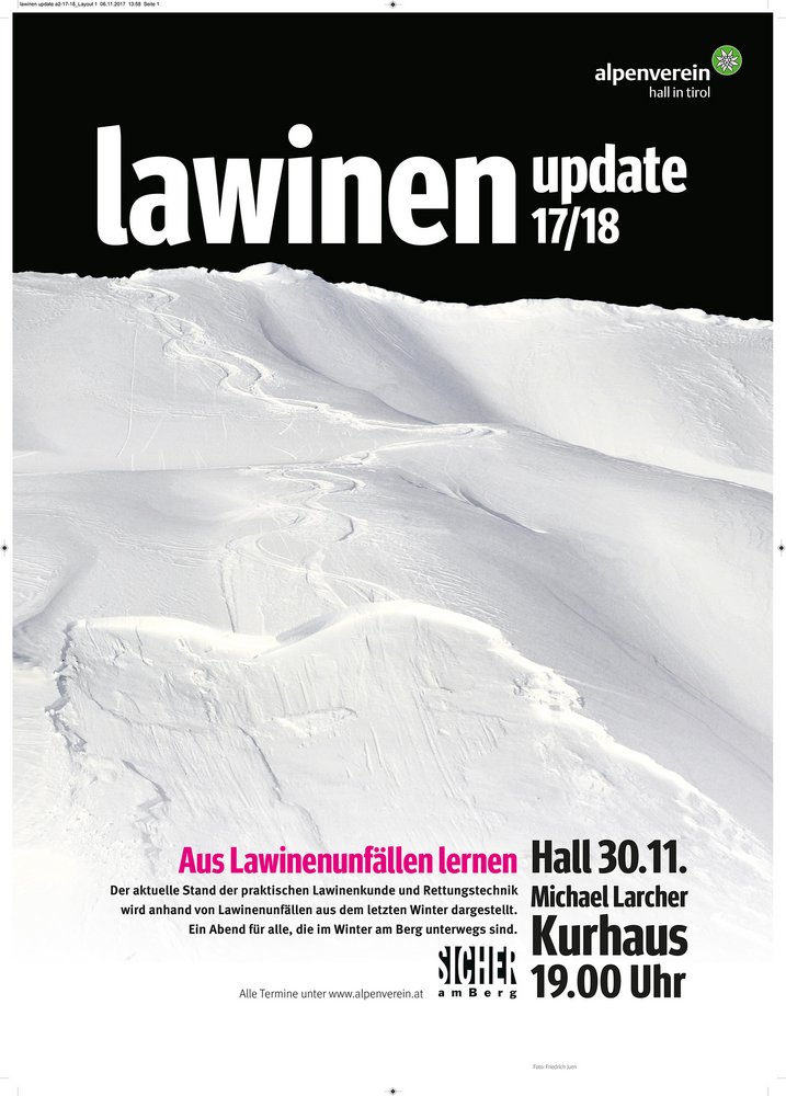 Die Vorträge hält Mag. Michael Larcher, Bergführer, Gerichtssachverständiger und Leiter der Bergsportabteilung im Alpenverein. „Rund 20 Tourengeher sterben Jahr für Jahr in Lawinen. Auch wenn nicht alle Lawinen vorhersehbar sind und Unfälle auch ohne menschliches Fehlverhalten passieren können, beobachten wir doch auch wiederkehrende Unfallmuster, die eindeutig vermeidbar wären. Das Lawinen Update ist für aktive Wintersportler DIE Gelegenheit, sich direkt zu informieren, ihr Wissen aufzufrischen und sich in einem kurzweiligen Abend das Rüstzeug für eine sichere Wintersaison zu holen“, so der Lawinenexperte.