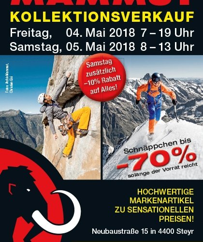 Wie jedes Jahr gibt es bei Mammut Österreich den legendären Kollektionsverkauf. Diesen Frühling findet er offiziell vom 04. bis 05. Mai statt. Neben Schnäppchen bis -70% gibt es auch eine große Auswahl an Produkten aus dem gesamten Produktsortiment von Mammut.