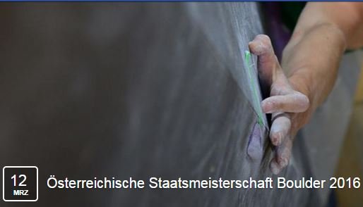 Am 12.03.2016 wird bei der österreichischen Staatsmeisterschaft im Bouldern (ÖSTM) im Bloc House Graz die versammelte heimische Kletterelite um Jakob Schubert, Lukas Ennemoser (Titelverteidiger), Jessica Pilz (Titelverteidigerin) und Anna Stöhr antreten.