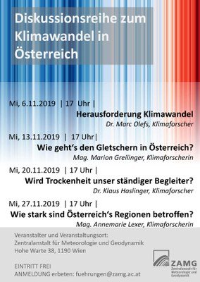 Der Vortrag ist Teil einer Diskussionsreihe zum Klimawandel und findet im Zuge des Wettertreffs der ZAMG statt. Die Termine der Diskussionsreihe:
