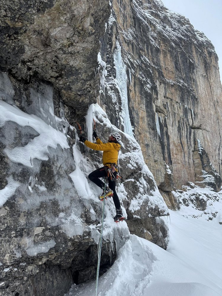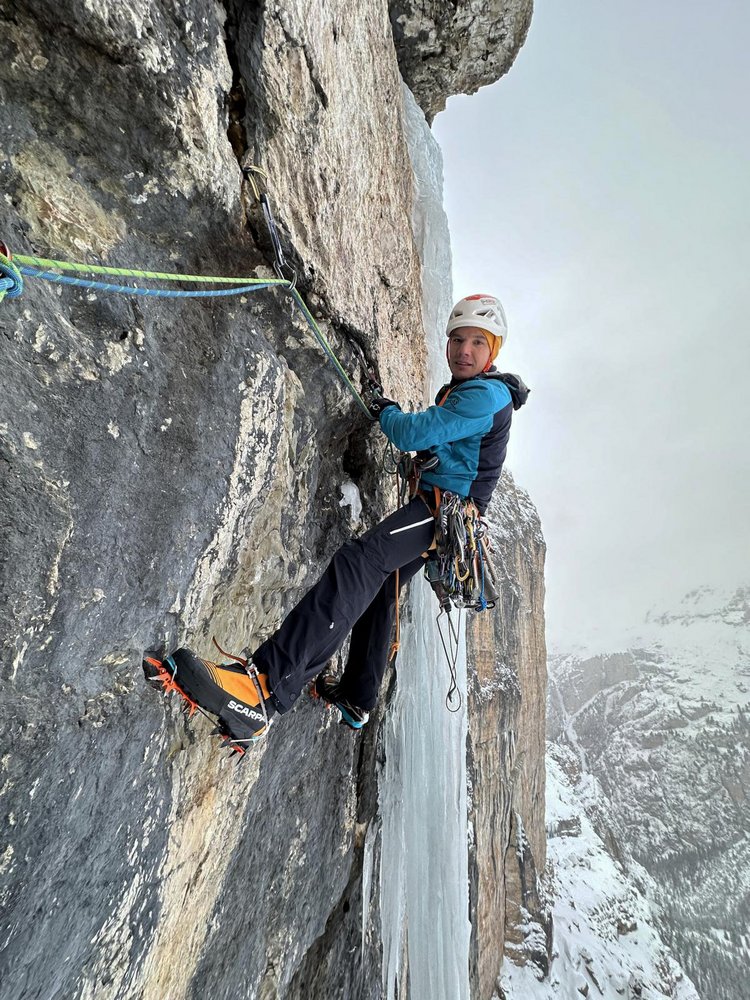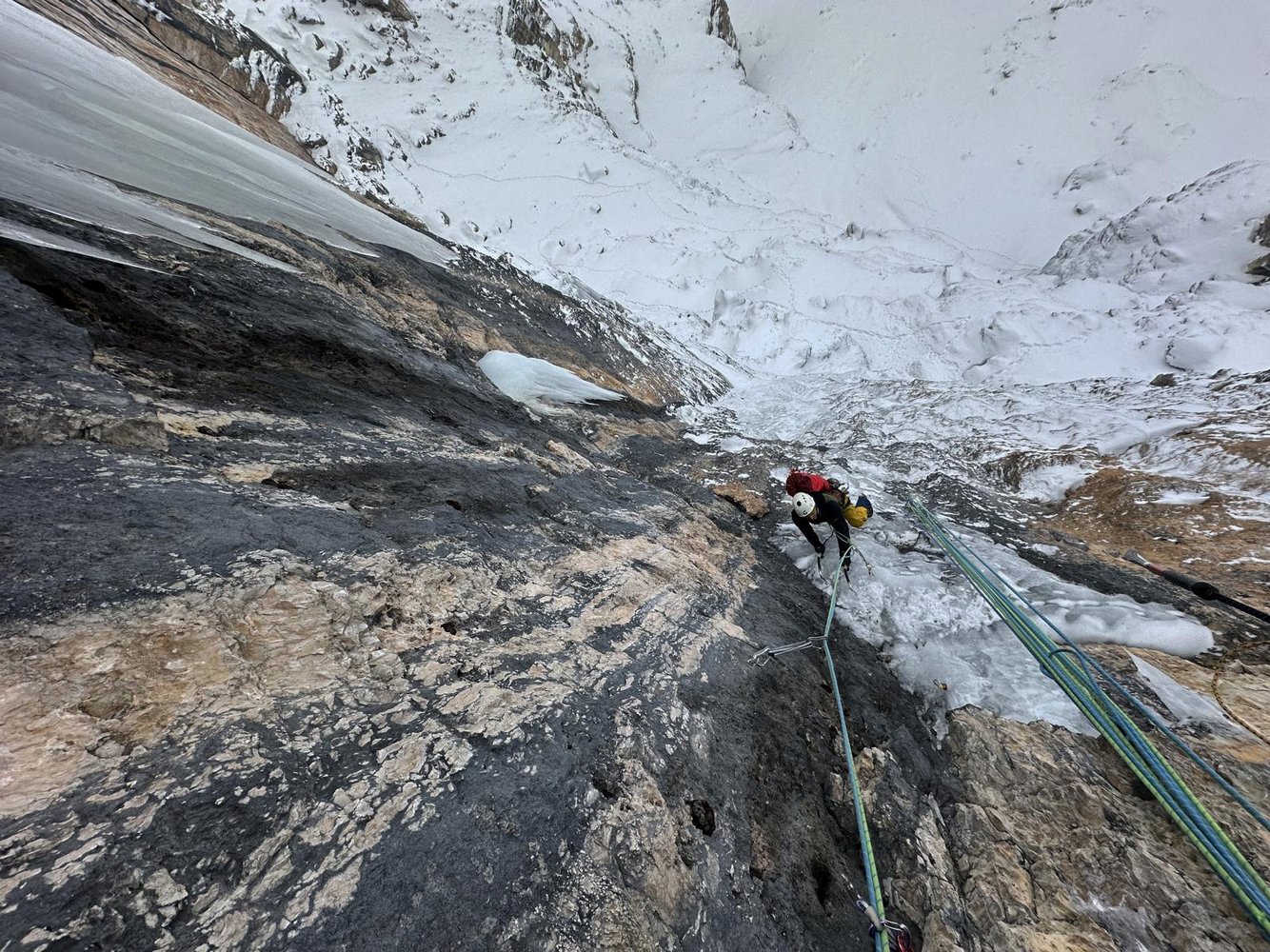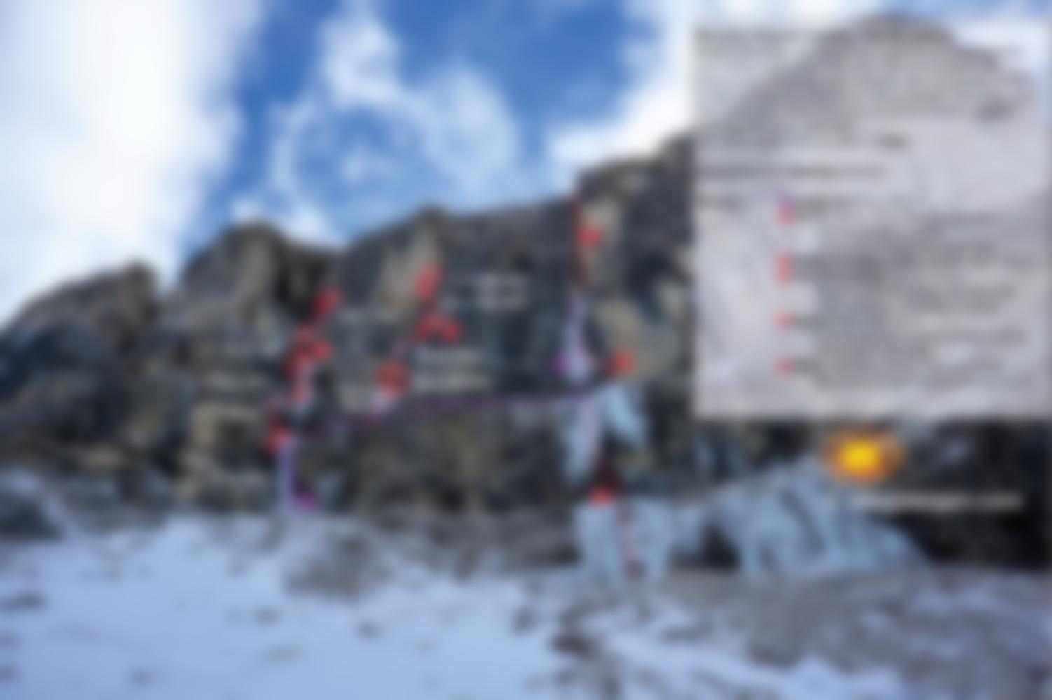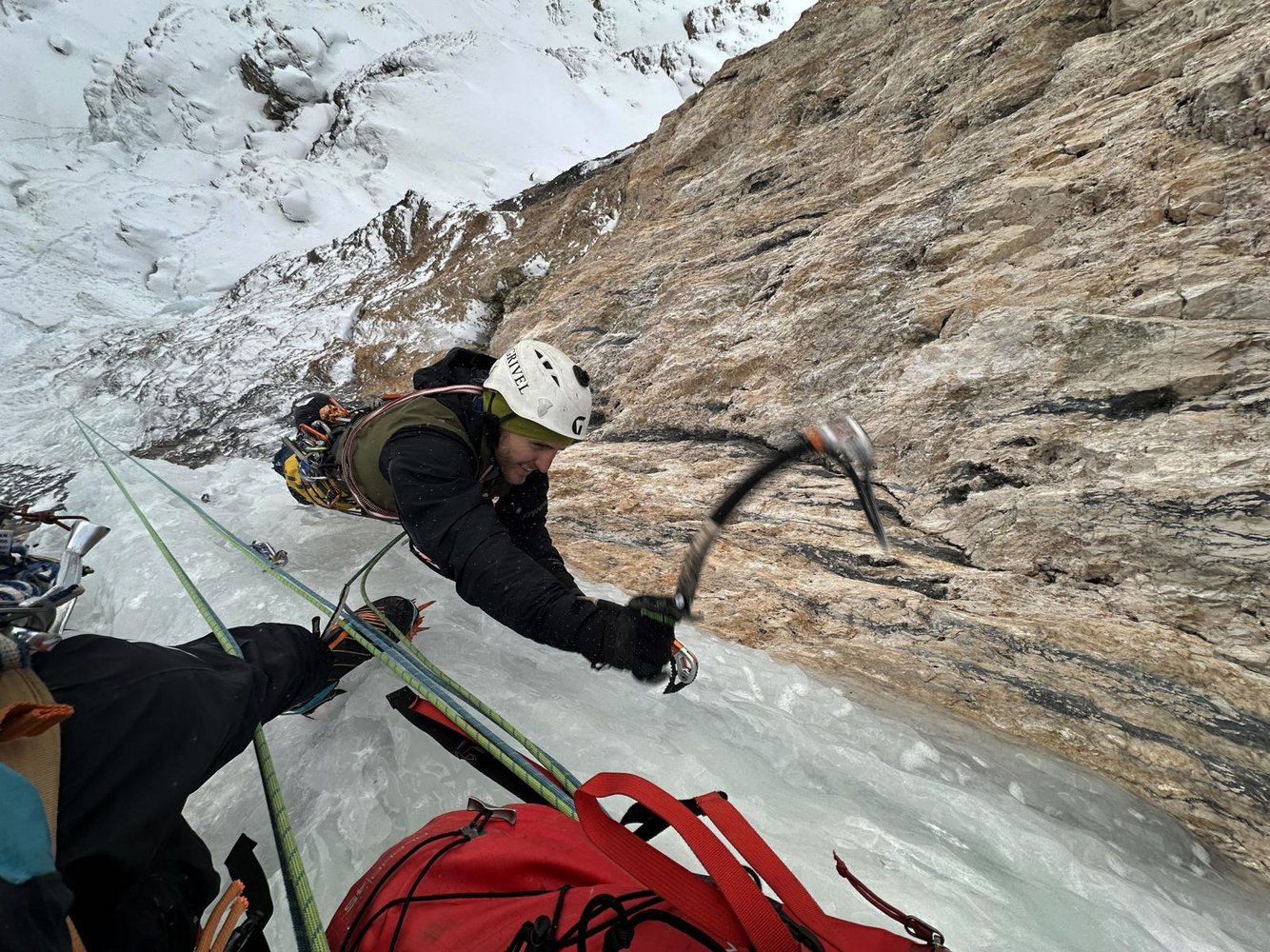 - 15m M8 WI5+Nach rechts über einen super überhängenden Riss zur hängenden Eiskerze, diese hoch und stand im Eis