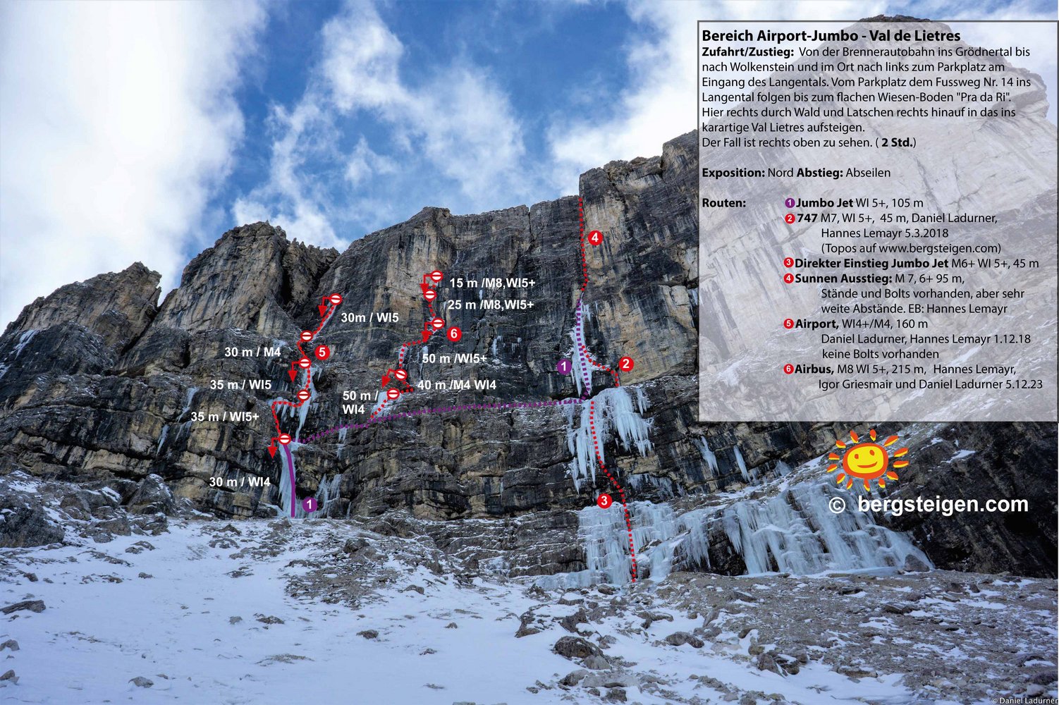 - 50m WI4 (vom ersten stand Jumbo nach rechts und Eis gerade hoch, stand Köpfel auf Band)