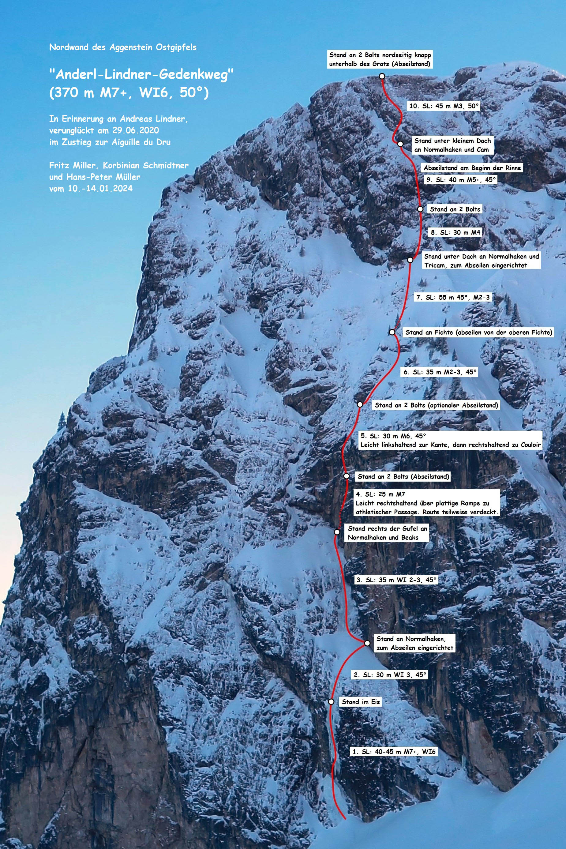 Herausfordernde alpine Mixedkletterei inmitten der Nordwand des Aggenstein Ostgipfels. Wiederholer erwartet die ganze Bandbreite des Winterkletterns, inklusiv schwieriger Eiskletterei und der am Aggenstein typischen Graskletterei. Obwohl es sich um eine Route im Stil einer Direttissima handelt, ist die Linienführung stets intuitiv. Die Route verläuft in der 3. Seillänge (Eisfall) sowie in der 7. Seillänge (Grasschulter) auf der Linie des Isidor-Hacker-Gedenkwegs, woraus sich verschiedene Kombinationsmöglichkeiten ergeben.