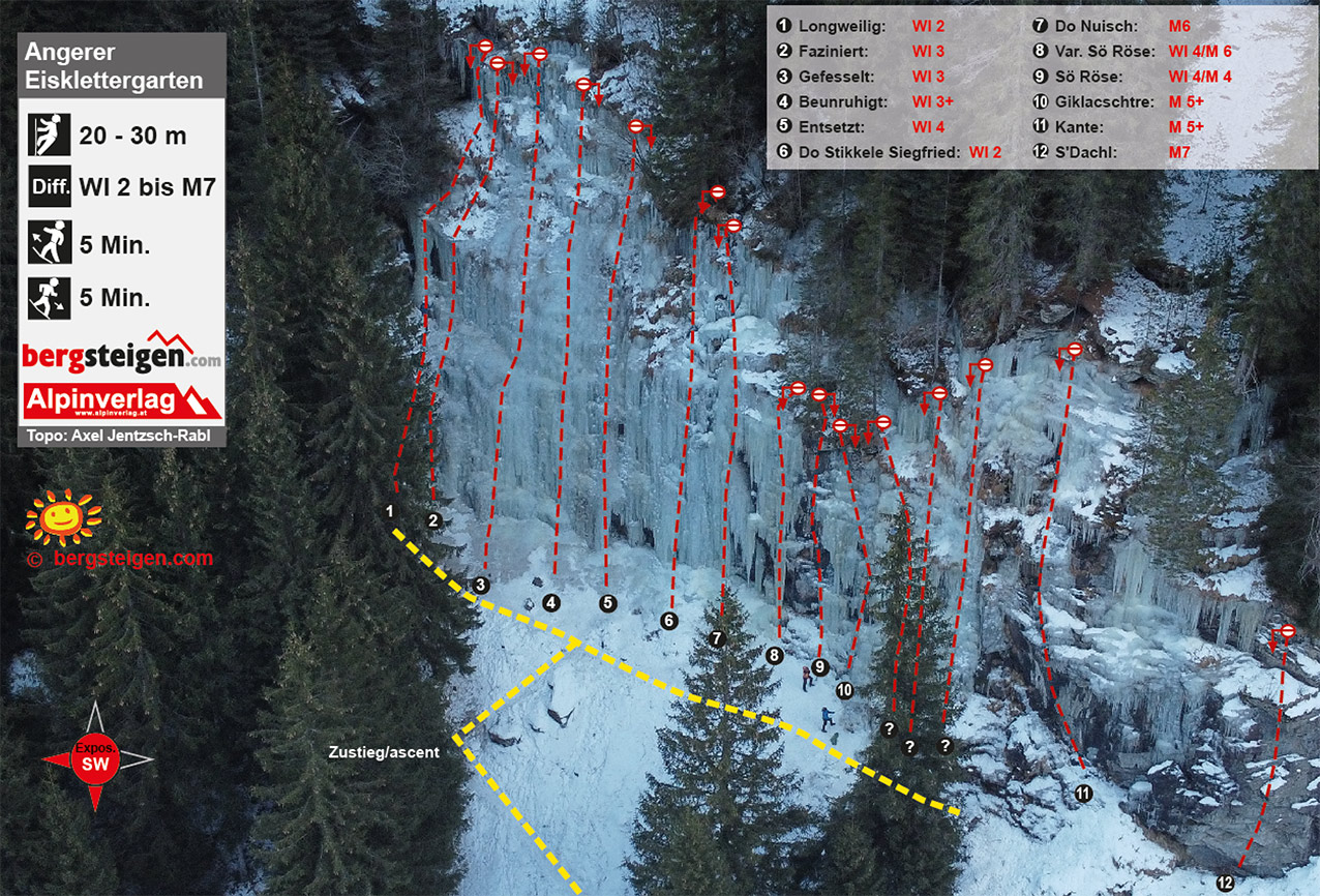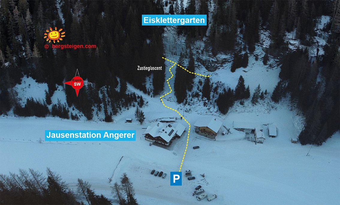 Der Angerer Eisfall oder auch Angerer Eisklettergarten genannt, befindet sich direkt hinter der Jausenstation Angerer und wird in der kalten Jahreszeit von Eiskletterern und Eiskletterkursen regelrecht gestürmt. Es gibt an dem ca. 20 bis 30 Meter hohen Eisschild viele Routen von WI 2 bis M7 und das alles direkt bei einer Jausenstation vor der man das Auto parkt. Aber Achtung, wer sich einen Platz unter den Eiszapfen zumindest am Tagesbeginn aussuchen will, muss zeitig aufstehen, zu Mittag steht man in der Stoßzeit oft wie in der Kletterhalle Schulter an Schulter.