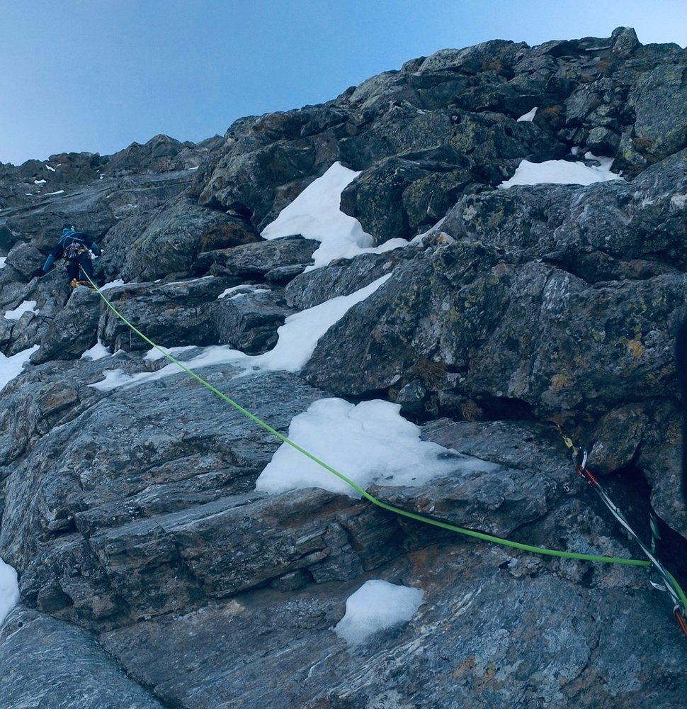 (Alternativ bei viel Schnee über die Ostrinne absteigen (2x Abseilen) und direkt zurück zum Einstieg