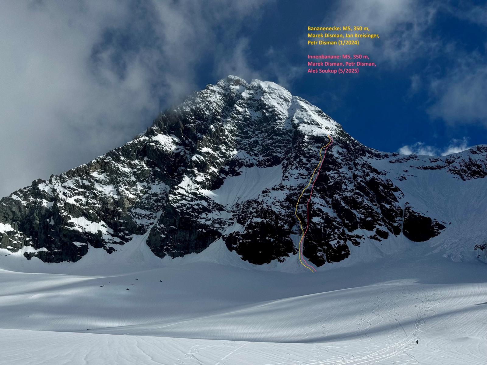Die Route beginnt am Fuß eines Schneekegels und quert nach links über einen Bergschrund auf vereiste Platten (eine alternative Route – Innenbanane – führt rechts über das Schneefeld in eine felsige Verschneidung). Die Linie folgt den Eisplatten gerade nach oben. In der dritten Seillänge quert sie nach rechts über einen Felsrücken und folgt dann einem logischen Verlauf durch gemischtes Gelände aus Eis- und Felsstufen bis zum Hauptschneefeld an der Südostwand, wo die Route endet.