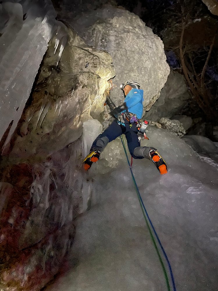 Komplette Eis- und Mixedkletterausrüstung. Felsteil ist gebohrt, am Ende ist ein Abseiler eingerichtet.