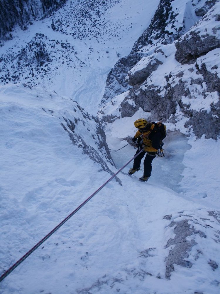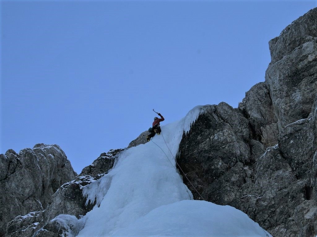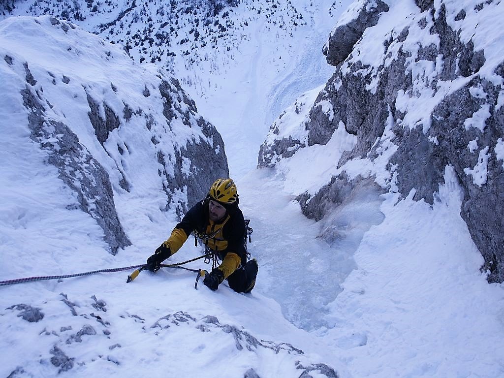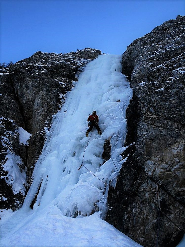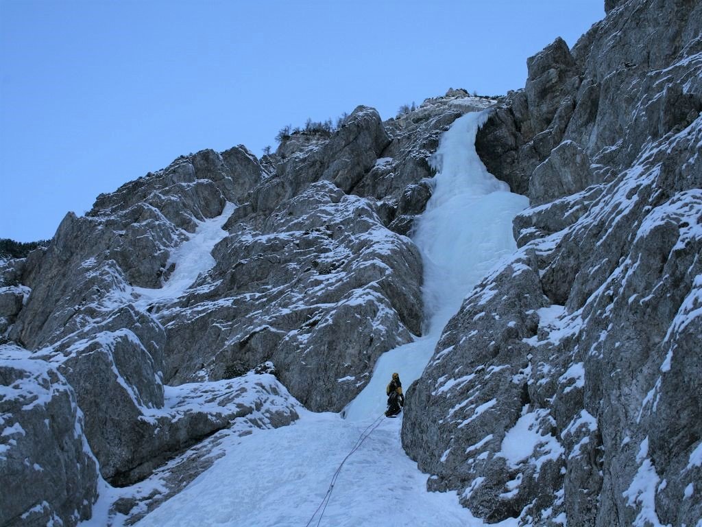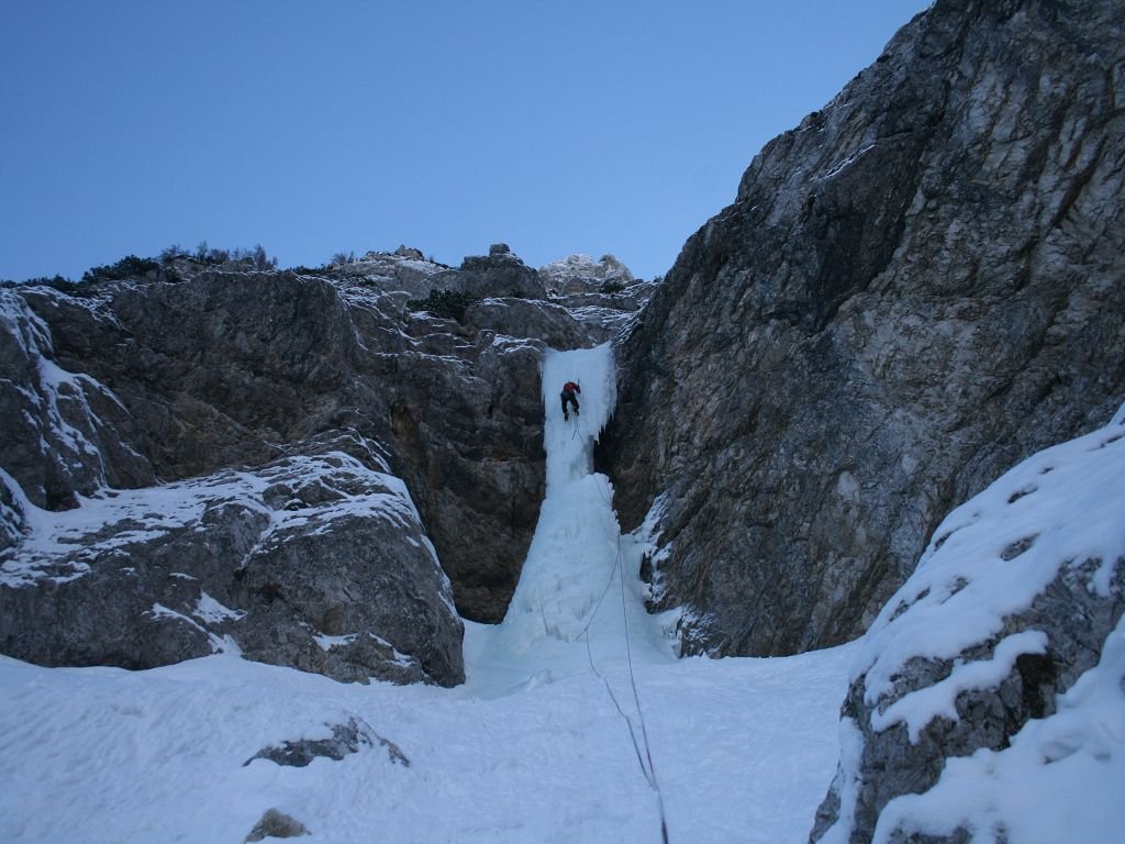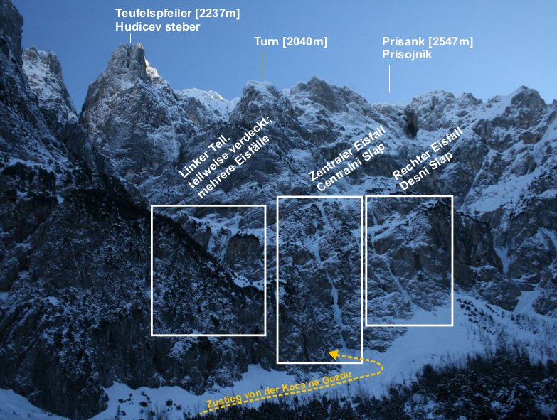 Sehr schöner Eisfall mit 5 Seillängen, der alpinen Charakter vorweist. Die Stände sind großteils mit Haken bzw. teilweise sogar mit Bohrhaken eingerichtet, dennoch sollte man den Umgang mit Abalakov- Eissanduhren beherrschen. Die Schlüsselstelle befindet sich in der 3. Seillänge: Eine ca.15 Meter hohe Kerze, die aber nicht immer steht bzw. sehr oft röhrig ist. Wie bei allen Touren am Fuße des Prisanks gilt, dass man bei zu viel Schnee nicht einsteigen sollte - die Lawinengefahr aufgrund des großen Einzugsgebiets ist enorm. „Desni slap“ bedeutet im Übrigen „rechter Eisfall“.