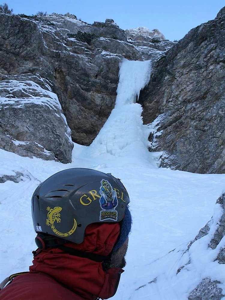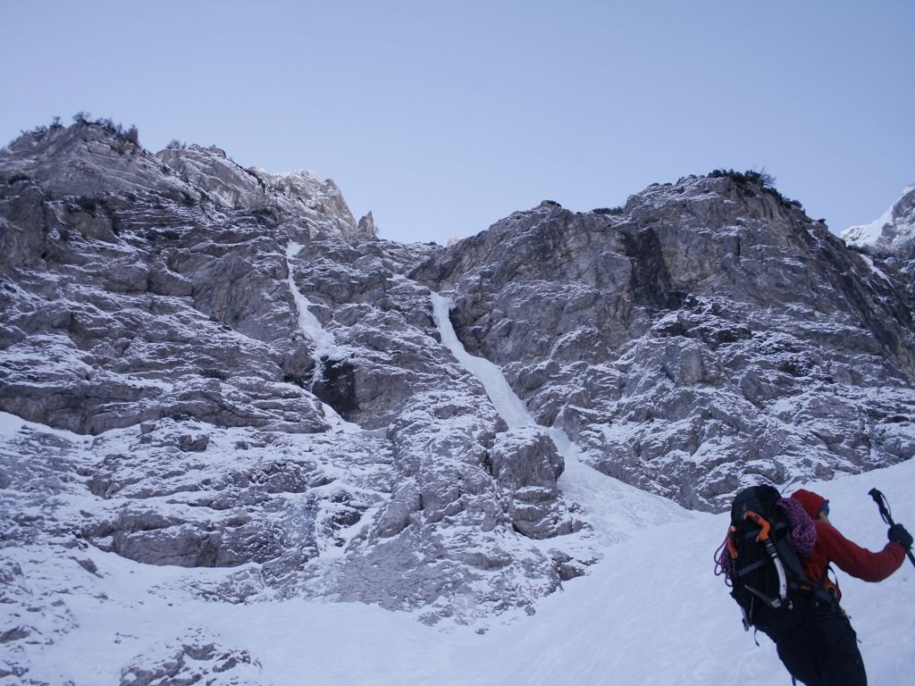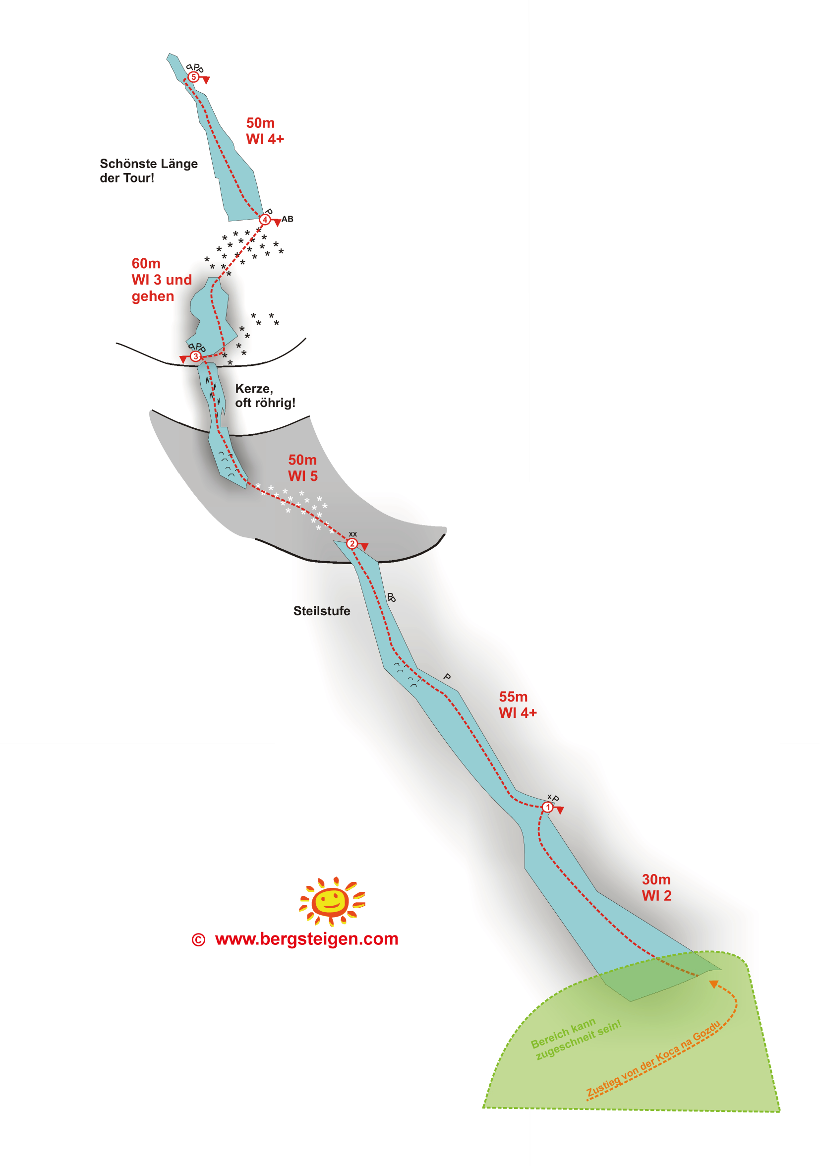 Von der Hütte geht man etwa 100 Meter auf der Straße weiter, und biegt dann nach links auf einen Weg ab, der leicht abwärts in Richtung Suha Pisnica (Eigenname und Ortsbezeichnung für ein offenes, latschendurchsetztes Tal) führt. Hier sieht man bereits die Eisfälle und steigt über den Rücken auf zum Einstieg. Der gesamte Weg ist quasi immer ausgetreten!