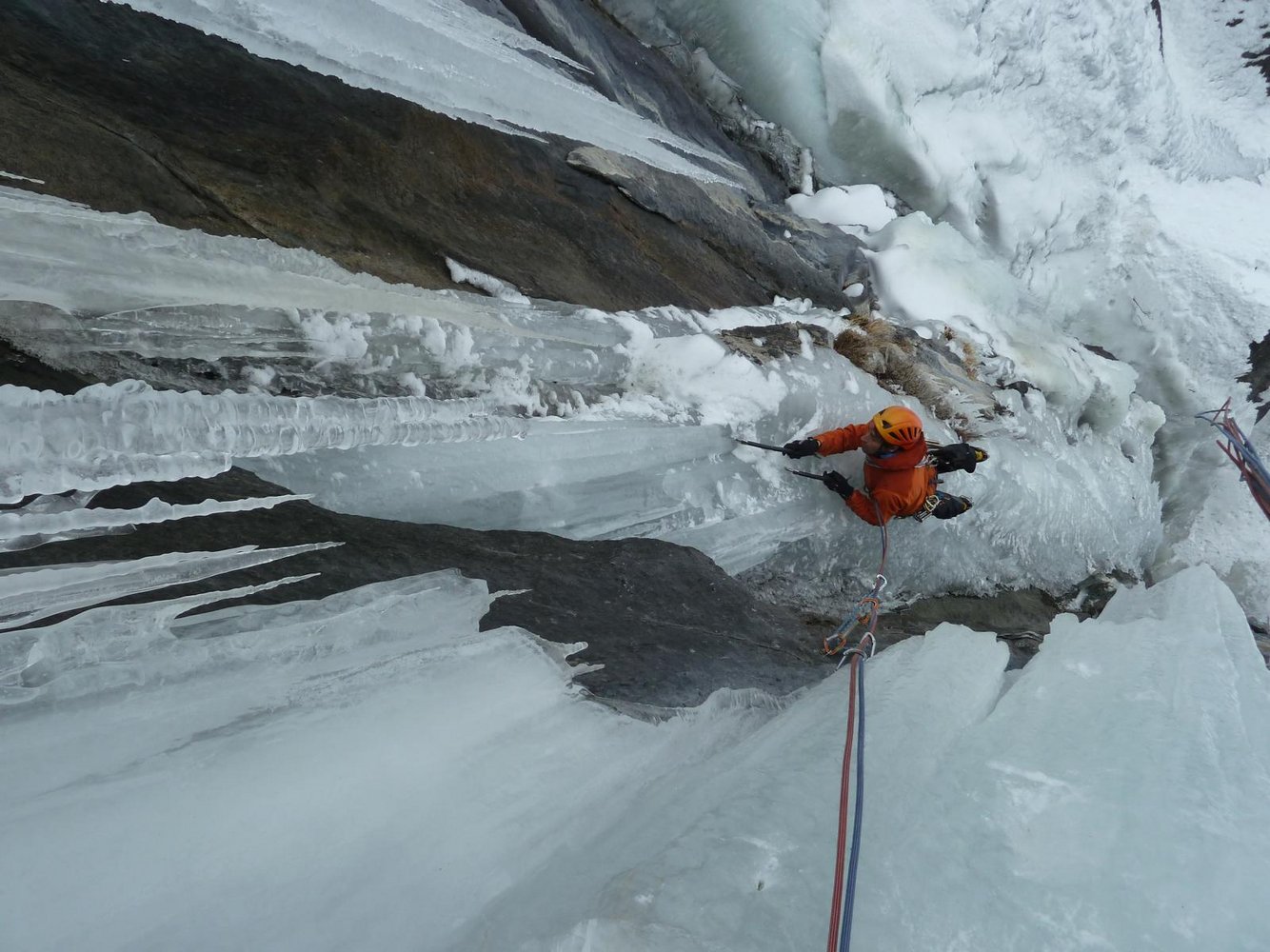 Expressschlingen, normale Eisausrüstung, 1 Satz Cams 0,3-3, 60 m Doppelseil. "Icemaster" ist mit Bohrhaken abgesichert (Detail siehe Topo).