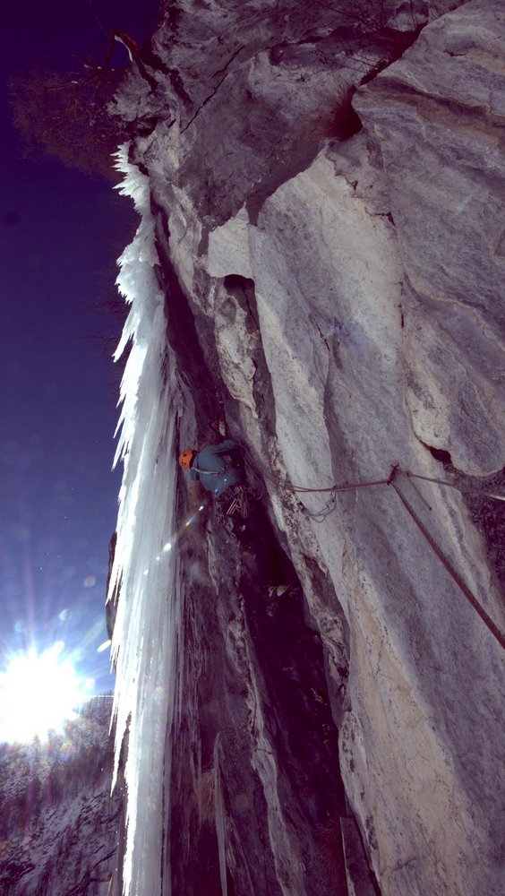 Rockmaster (M 8+): Die zweite hammergeile Mixedlänge mit super Fels und steiles Eis entschädigt die etwas grasige erste Länge! Die Morgensonne garantiert geniale Fotos!